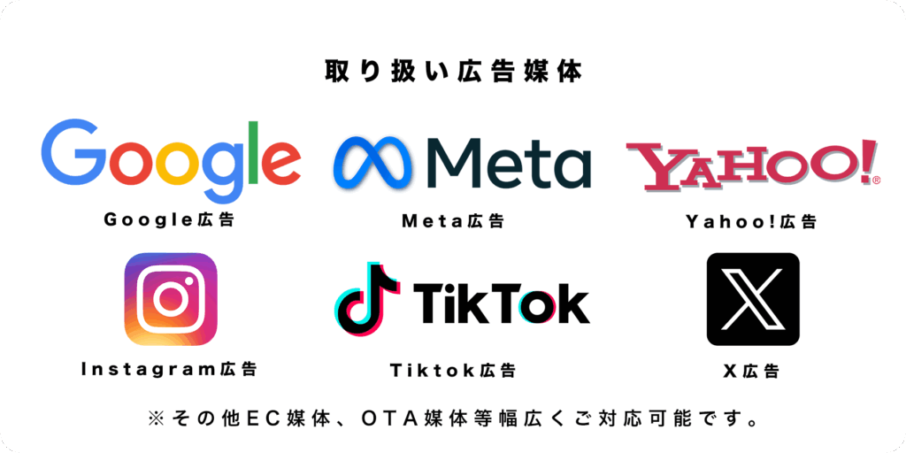 | 事業内容 | 広告運用代行 ウェブサイト制作・運用 アクセス解析・SEO設計 デザイン・イラスト・バナー制作 動画制作 SNSアカウント運用・広告 LINE導入・Lステップ構築支援 マーケティングコンサルティング |
